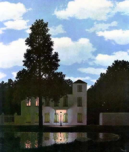 아이디어가 번쩍 스쳐 갔다. <길 잃은 기수(1926)>, <비밀의 운동선수(1927)>를 완성하면서 마그리트는 다다이스트에서 초현실주의자로 변신했다. 그러나 다른 작가처럼 꿈과 성적 탐구를 포기하는 대신, 실재하는 이미지를 역설적으로 배열했다. <빛의 제국>이 대표적이다. 어두운 밤, 불빛이 건물 유리창 통해 슬며시 새어 나온다. 가스등은 연못에 자신의 내면을 드러냈다. 은은하다. 낯익은 풍경이다. 그런데 시선을 높여 하늘을 보자 상황이 뒤집힌다. "어! 밝은 대낮이네." 뭉게구름이 둥실, 능청스럽게 떠 있다. 낮과 밤이 대화하며, 빛과 어둠이 공존한다. 현실에서 존재할 수 없는 ‘빛의 제국’이다. 마그리트는 1949년부터 1964년까지 모두 17점의 연작을 완성했다. 평소 그림에 관해 보완 설명이 없었던 작가의 해석이 전해진 것은 다행스러운 일이다.