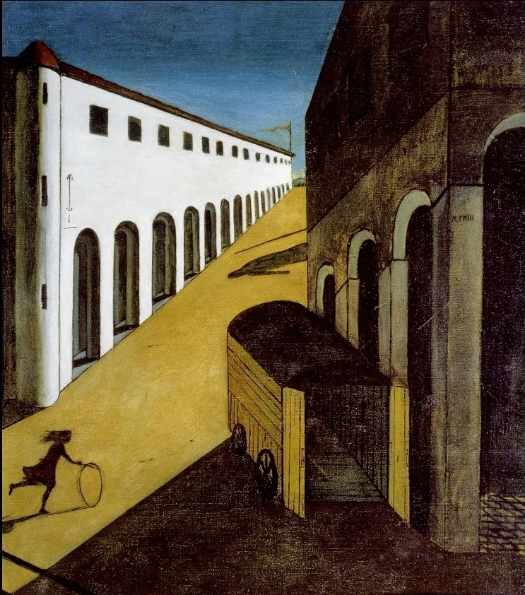 그는 1911년 파리에 도착하여 피카소를 알게 되었으나 입체주의와는 결을 달리했다. 니체 철학과 아르놀트 뵈클린(Arnold Böcklin, 1827~1901)의 작품에 감탄한 그는 몽환적이고 세밀한 사실주의 스타일을 완성했다. 하지만 통찰력을 갖춘 사람이라면, 그의 그림에서 인류가 사는 황량한 미래의 모습을 발견할 수 있다. <거리의 우울과 신비>도 악몽과도 같은 불안감을 조성한다. 긴 회랑을 잇는 아케이드 건물 사이, 아무도 없는 거리로 소녀가 굴렁쇠를 굴리며 입장한다. 하지만 그 앞에 등장한 거대한 그림자가 금세라도 연약한 소녀를 잡아 삼킬 듯하다. 사물의 내면에서 뿜어 나오는 비합리적인 공포를 보여주며 보는 이의 무의식을 자극한다.
