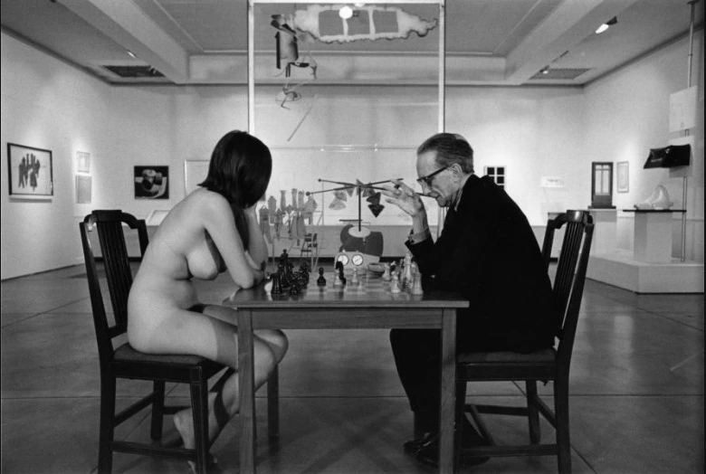 그는 1963년 회고전에서 <전라의 이브 바비츠와 체스를 두고 있는 마르셀 뒤샹>은 또 다른 신선함을 선물했다. 그는 1923년부터 1933년까지 세계 체스연맹의 국제 올림피아드 대회에서 프랑스 대표팀 선수로 활동했다. 우승도 여러 번 하면서 회화는 등한시한 채 체스에만 빠져 지내기도 했다. 하지만 이 퍼포먼스는 특정한 메시지보다 예술 형식의 변화를 눈여겨보아야 한다. 그는 곧 사라질 순간을 회화의 도구로 선택한 것이다.