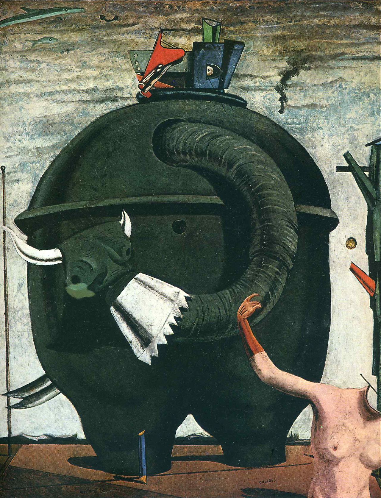 사실적인 형태다. 하지만 관계없는 것을 병치하여 새로운 이미지를 창출했다. 코끼리가 비행장처럼 보이는 곳에 우뚝 서 있다. 그런데 ‘코끼리’라고 그대로 받아들이기 어려운 기괴한 형상이다. 상부 구멍으로 연결된 코가 주름 잡힌 호스로 만들어졌으나 머리에 뿔이 났다. 소라고 해도 무리가 없다. 머리가 없는 여성 마네킹(?)이 코끼리에게 수신호를 보낸다. 그리고 오른편 탑 모양은 남근을 상징한다. 그렇다면, 뿔 달린 수소로, 제우스가 변장한 황소로 해석할 수 있다. 사실 이 괴물 ‘셀레베스(Celebes)’는 에른스트가 어릴 때 한 남학생이 쓴 음란한 시의 한 구절에서 취한 것이라고 한다. 그런데 왼편 상단에 두 마리 물고기가 헤엄친다. 이로써 당연히 육지라고 생각했던 배경이 물속으로 바뀌었다. 우울과 불안을 자아내는 초현실 세계다. 작품은 ‘런던 테이트 모던’에 전시되고 있다. 미술관은 템즈 강가의 화력 발전소였다고 하니 잘 어울리는 작품이라 하겠다.