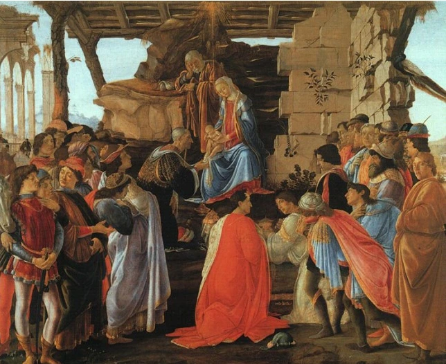 보티첼리의 작품 중 수작인 <동방박사의 경배>이다. 그의 초기 작품으로, 작품의 주제와 모티브가 베노초 고촐리의 <동방박사의 행렬>과 흡사하다. 똑같이 예수 탄생을 다루었지만, 배경과 복장 그리고 인물은 당시 모습이 아니다. 15세기 피렌체를 배경으로, 메디치 가문의 구성원을 그렸다. 다만 루카 피티의 음모를 모면한 데 감사한 마음으로 산타 마리아 노벨라 성당에 봉헌 예물로 바치기 위해 의뢰했다고 한다.