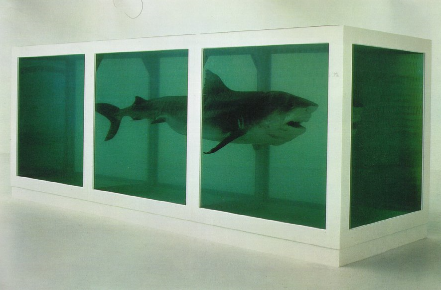 방부제 포름알데히드로 채운 유리 탱크 안에 15피트짜리 박제 상어를 넣었다. 그리고 작가는 알쏭달쏭한 제목을 붙였다. <살아 있는 자의 마음속에 존재하는 죽음의 물리적(육체적) 불가능성>. 제목만으로만 판단하면, 살아 있는 자가 죽음을 어떻게 상상하거나 생각할 수 있겠냐는 물음이다. 죽음을 중심 주제로 활동하던 작가 데미언 허스트(Damien Hirst, 1965~)는 작품을 이렇게 설명했다.