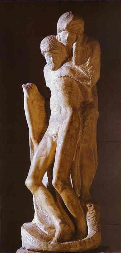 그러나 사후 발견된 <론다니니 피에타>는 이전의 작품들과 극명하게 대조를 이룬다. 수직으로 선 자세이며, 예수가 매우 수척해졌다. 숭고함보다는 고통과 절망이 발견된다. 사실적이라기보다는 심리적이다. 따라서 여든아홉 살 독실한 신앙인 미켈란젤로가 긴 여정을 앞두고 어떤 감정으로 마지막 작품에 임했는지 짐작이 가는 대목이다.
