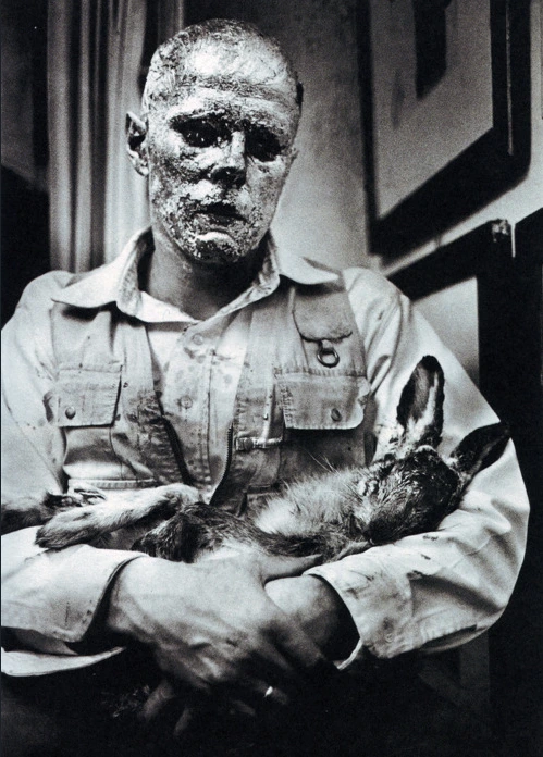 독일이 낳은 20세기 최고의 예술가 요제프 보이스(Joseph Beuys, 1921~1986)가 머리에 꿀과 금박을 뒤집어썼다. 그리고 안고 있는 죽은 토끼에게 약 2시간 동안 미술관 그림을 설명했다. 퍼포먼스 <죽은 토끼에게 어떻게 그림을 설명할 것인가(1965)>이다.