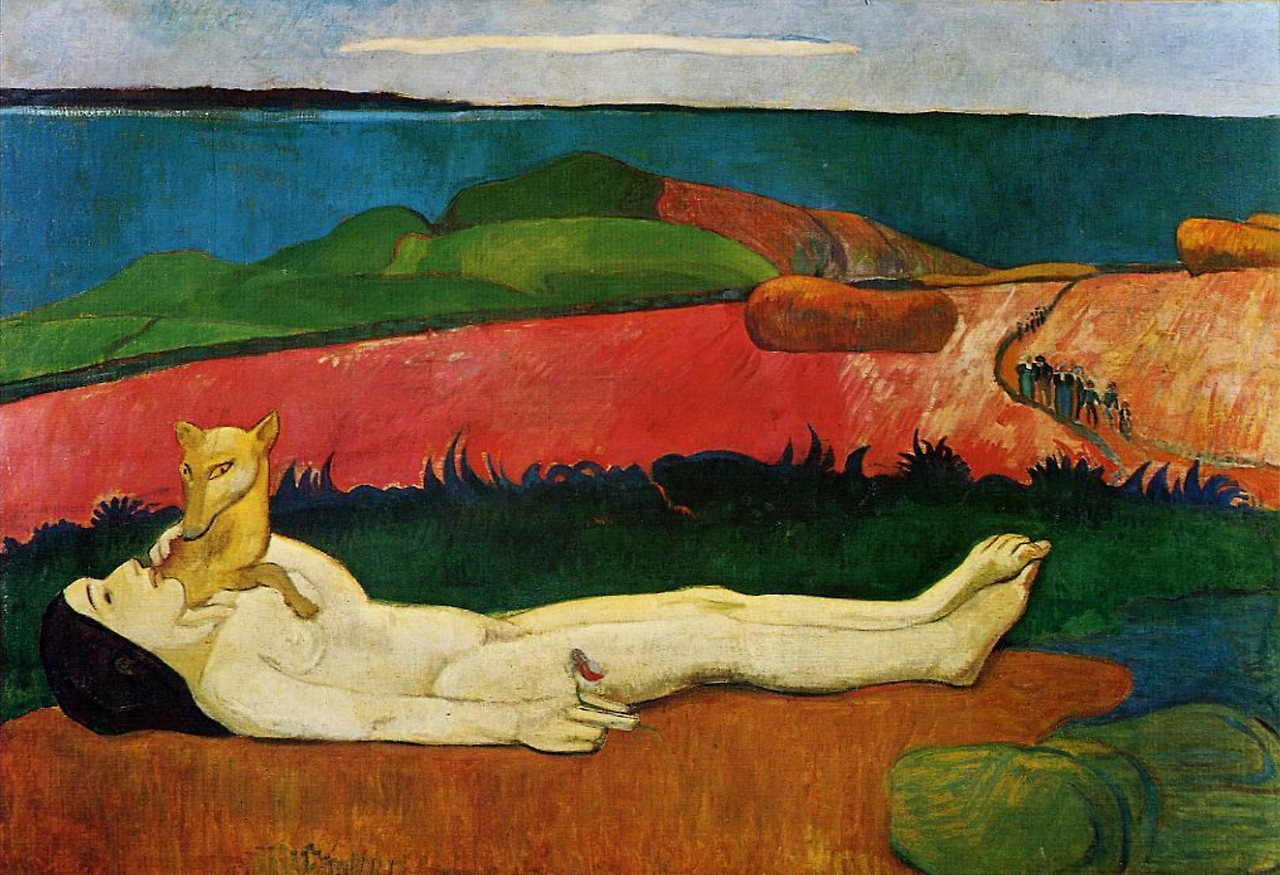 고갱의 독창성은 색채에 있다. 그는 “조화를 위해서라면, 색을 임의로 사용할 권리가 화가에게 있다”라는 태도를 보였다. 이 그림에서도 들판을 비현실적인 빨간색을 칠해 몽환적인 세계를 표현했다. 이후 그의 혁신은 상징주의 ‘나비파’와 앙리 마티스의 ‘야수파’로 이어졌다.