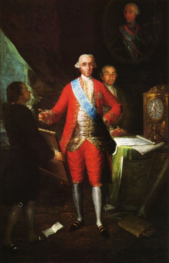 많은 사람이 고야를 일컬어 ‘출세 지향적’이었다고 평한다. 맞는 말이다. 후진적인 스페인 예술 환경을 의식하여 때에 따라 자신의 탐구 정신을 숨길 줄 알았다. 정치적 실력자에겐 기꺼이 무릎도 꿇었다. 그의 첫 번째 공식 초상화는 <플로리다 블랑카 백작>이다. 부르봉 왕가의 계몽주의 군주 카롤로스 3세(그림 속 벽에 걸린 초상화의 주인공)를 도와 스페인 재건에 힘쓴 인물이다. 붉은색 겉옷에 반짝이는 금빛 셔츠를 받쳐 입은 블랑카 백작은 어두운 배경으로 인해 더욱 강렬한 인상을 준다. 고야가 직접 왼편에 등장하여 자신이 그린 그림을 보여주며 그의 허락을 구한다. 그러나 재상은 시선조차 주지 않고 정면을 뚫어지게 응시하고 있다. 비굴하게 보일 수도 있다. 하지만 계몽주의에 심취했던 그의 존경심을 표현하는 방식이었다. 여하튼 고야의 이런 노력이 열매를 맺어 1774년 궁정 태피스트리 밑그림부터 시작한 그는 1786년 궁정화가에 임명되었다.
