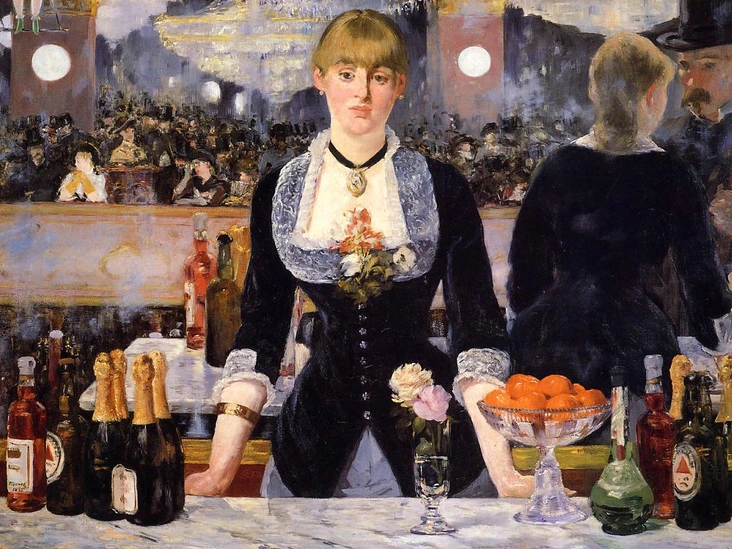 그러나 드가보다 30여 년 먼저 떠난 마네의 작품에는 미술사적으로 전환점을 가져온 경우가 많았다. 죽기 1년 전 혹독한 보행 장애를 겪으면서도 완성한 <폴리 베르제르의 바>가 그중 하나다. 종업원 쉬종(Suzon)이 정면 한가운데서 탁자에 손을 얹은 채 건조한 시선으로 서 있다. 바로 뒤 거울에는 극장식 술집 폴리 베르제르 안의 손님들 빈자리 없이 꽉 찼다. 서커스를 하는지 왼쪽 상단 모서리 부분에 사람 다리 한 쌍이 보인다. 화려한 샹들리에 아래에는 오페라글라스로 공연을 구경하고 여인이 눈에 들어오고, 테이블에 앉은 일행간 음식과 함께 오고 가는 술잔 속에서 떠드는 소리가 시끌벅적하게 들린다.