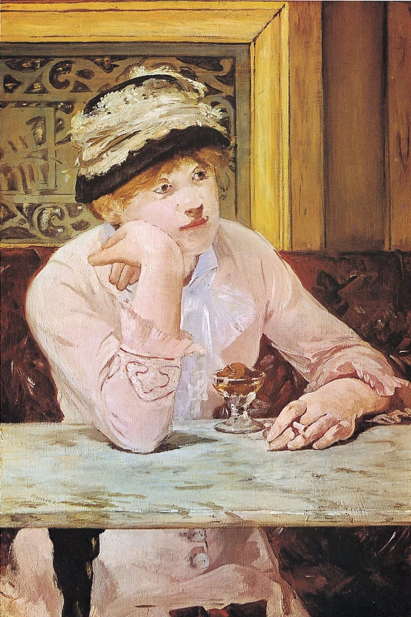 손님들에게 오늘 하루가 특별한 날일지 모른다. 하지만 일하는 여성에게는 반복되는 노동일뿐이다. 그녀의 시선은 의미 없이 허공에 머무른다. 노동자 여성의 피곤과 고독을 표현한 작품은 마네의 유언장이라 할 수 있다. 이런 맥락에서 ‘바니타스(vanitas, 라틴어로 죽음의 공허(空虛)함)’를 그렸다고도 할 수 있겠다. (질 네레, <에두아르 마네>) 이곳은 19세기 파리에서 유행했던 카페 콩세르(Café Concert) 중 한 곳이다. 19세기 밤 유흥문화를 엿볼 수 있다. 그런데 쉬종에게서 발견되는 팔찌와 초커 목걸이, 그리고 장미에서 <올랭피아>가 연상된다. 어쩌면 그녀가 앞에 진열된 술병처럼 상품화되었다는 사실을 의미할 수 있겠다.
