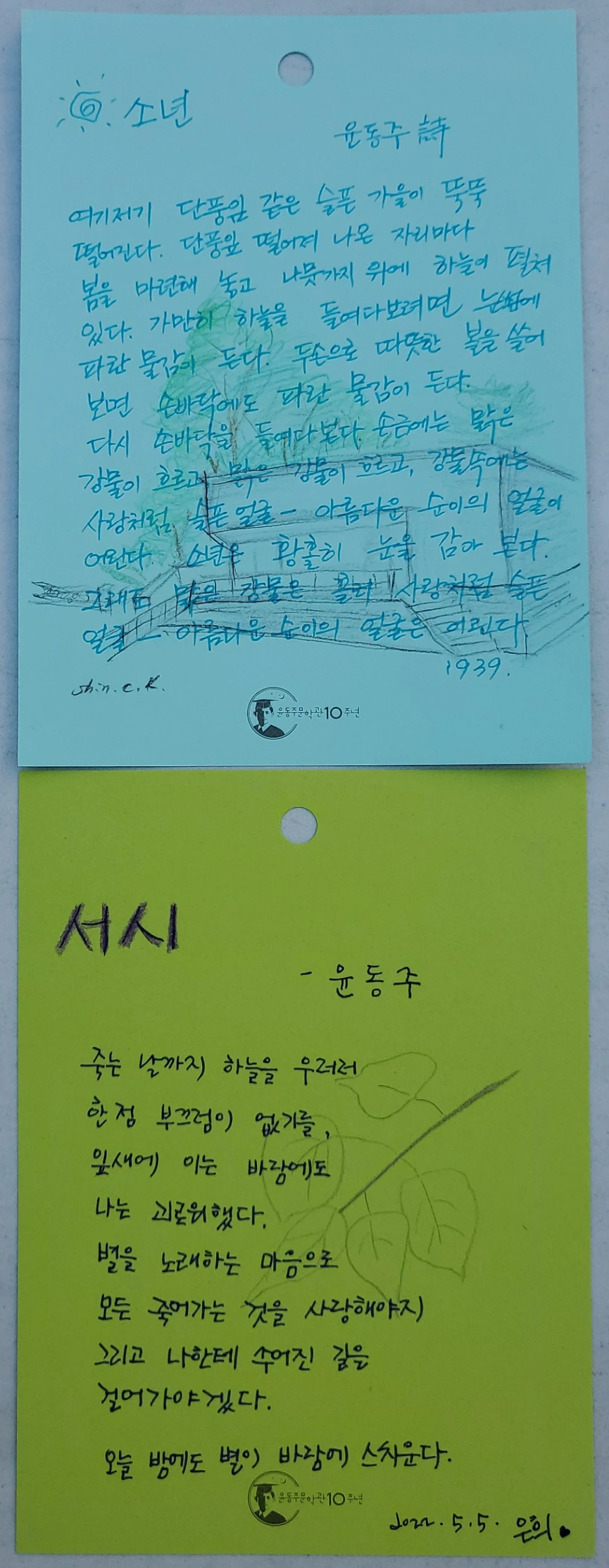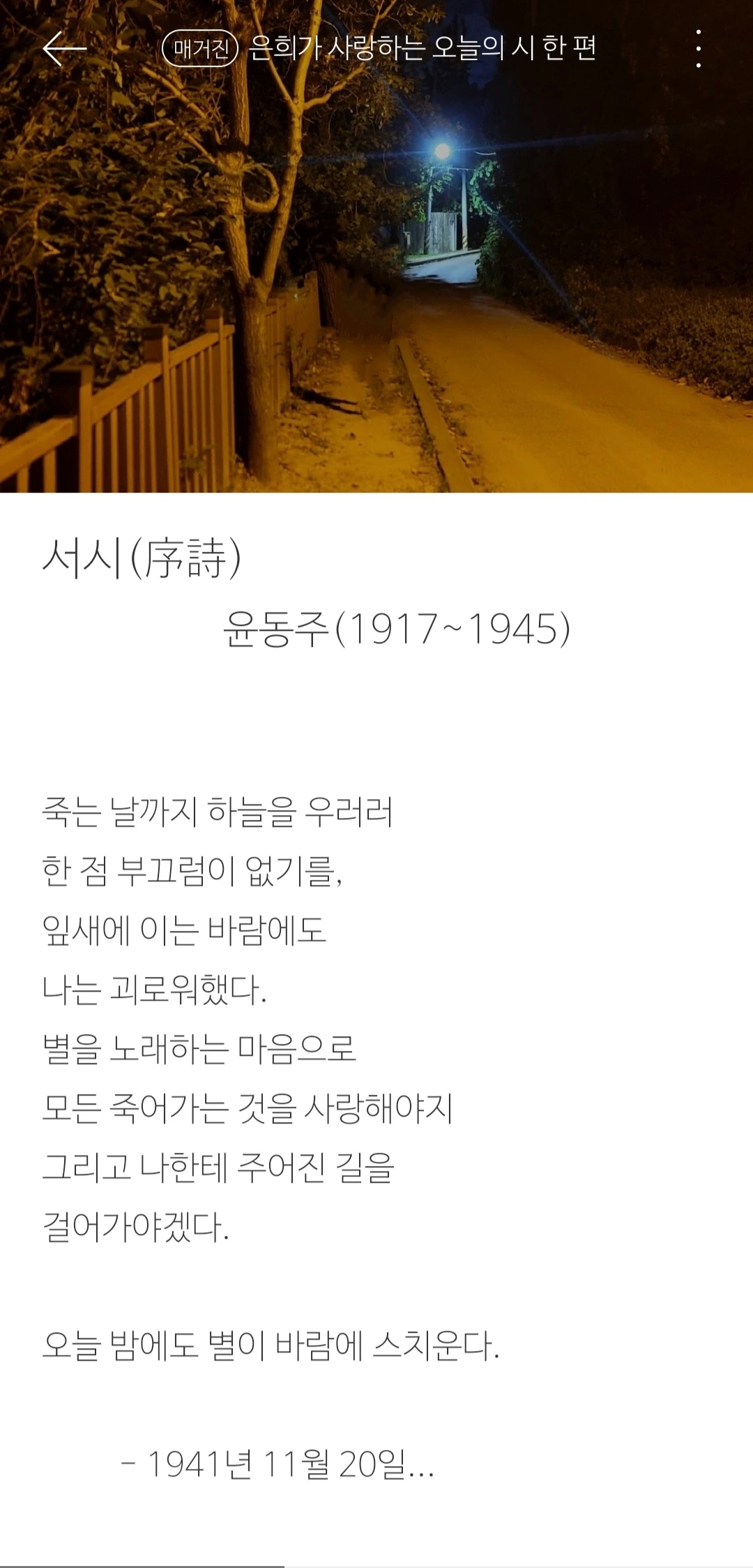 '오늘 밤에도 별이 바람에 스치운다'로 끝을 맺는 당신의 詩처럼 정말 오늘 이 밤에도 별은 바람에 스치우고 있을 테지요.