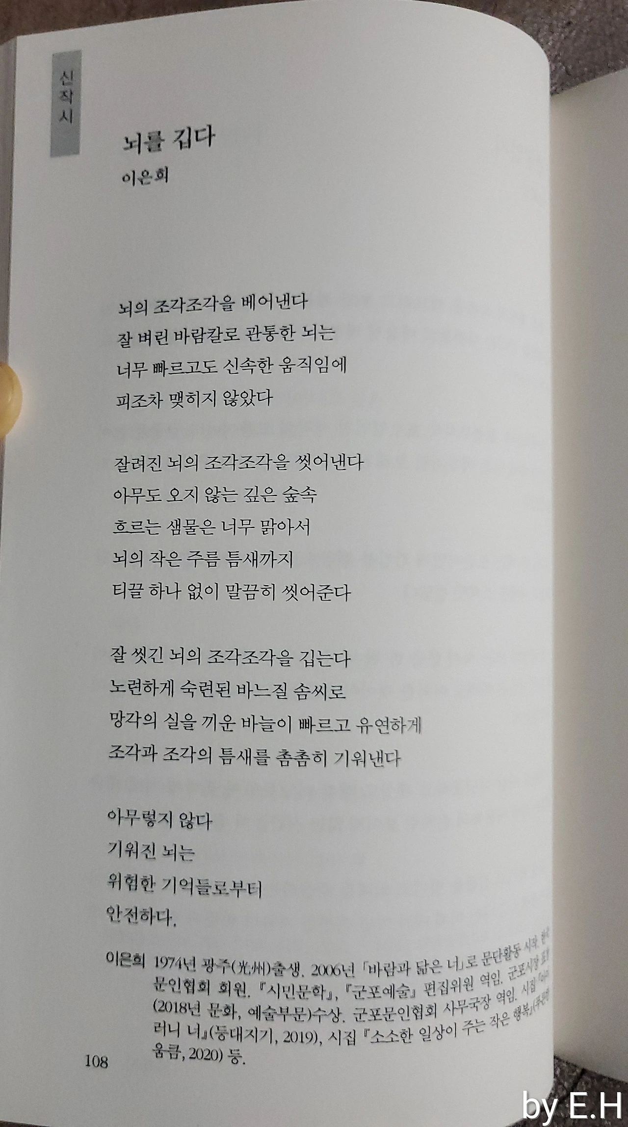 기워진 뇌는 위험한 기억들로부터 안전하다. | 뇌를 깁다 이은희 뇌의 조각조각을 베어낸다 잘 벼린 바람칼로 관통한 뇌는 너무 빠르고도 신속한 움직임에 피조차 맺히지 않았다 잘려진 뇌의 조