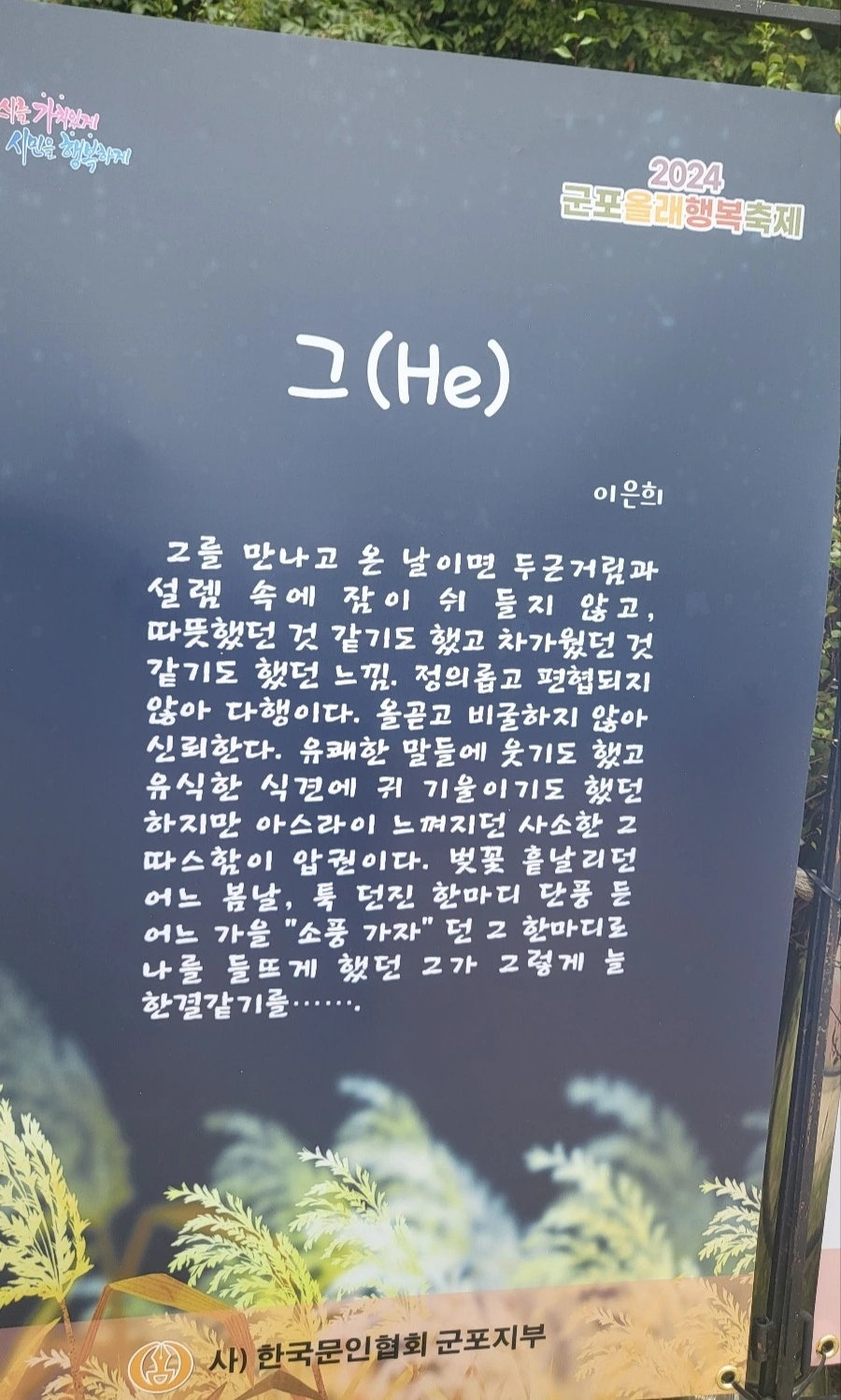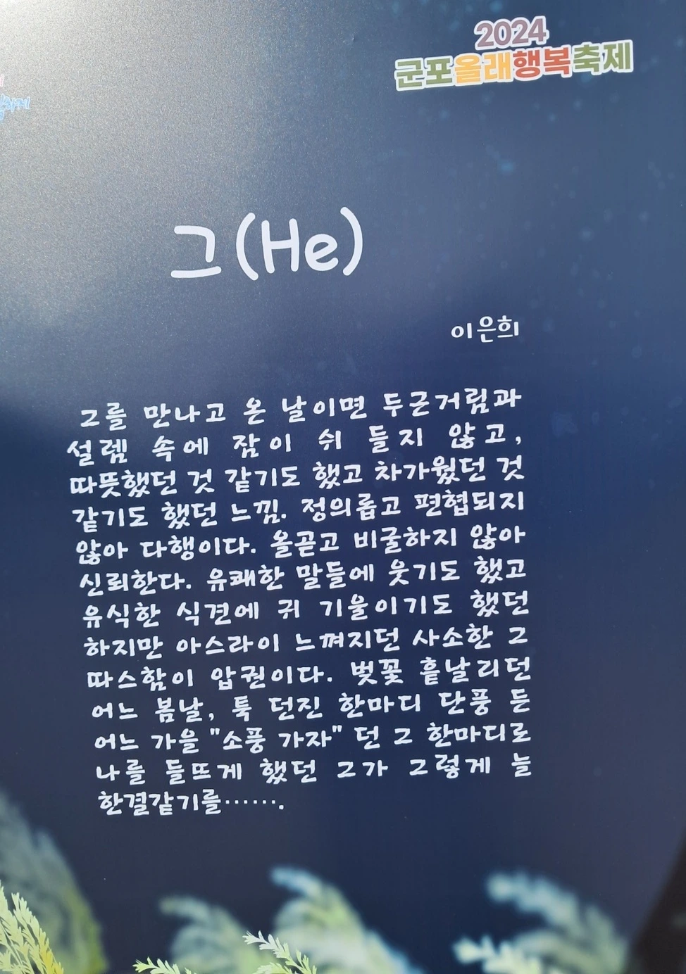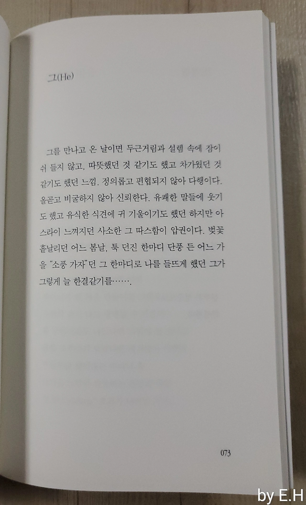 그를 만나고 온 날이면 두근거림과 설렘 속에 잠이 쉬 들지 않고, 따뜻했던 것 같기도 했고 차가웠던 것 같기도 했던 느낌! 정의롭고 편협되지 않아 다행이다. 올곧고 비굴하지 않아 신뢰한다. 유쾌한 말들에 웃기도 했고 유식한 식견에 귀 기울이기도 했던 하지만 아스라이 느껴지던 사소한 그 따스함이 압권이다. 벚꽃 흩날리던 어느 봄날, 툭 던진 한마디 단풍 든 어느 가을 “소풍 가자” 던 그 한마디로 나를 들뜨게 했던 그가 그렇게 늘 한결같기를…….