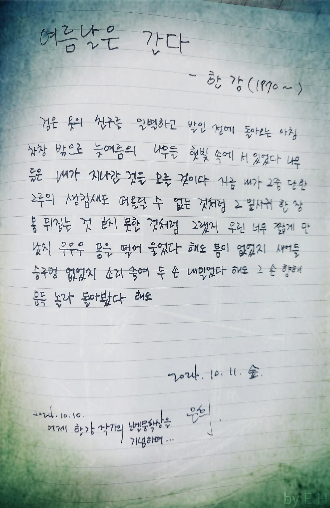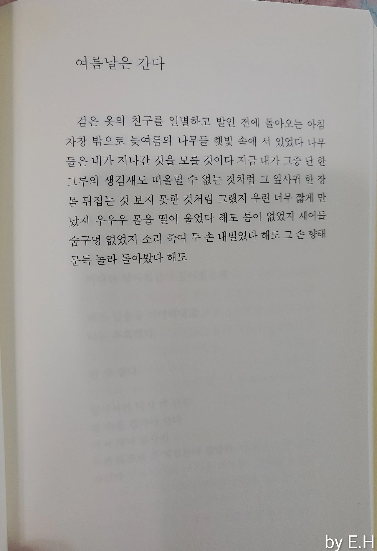 그런 마음을 가득 담아서 아침 그녀의 시집을 펼치고 그 시집에서 내 마음에 오늘 더 와닿아서 이 詩 <여름날은 간다>를 아름다운 가을 오전에 필사했다.