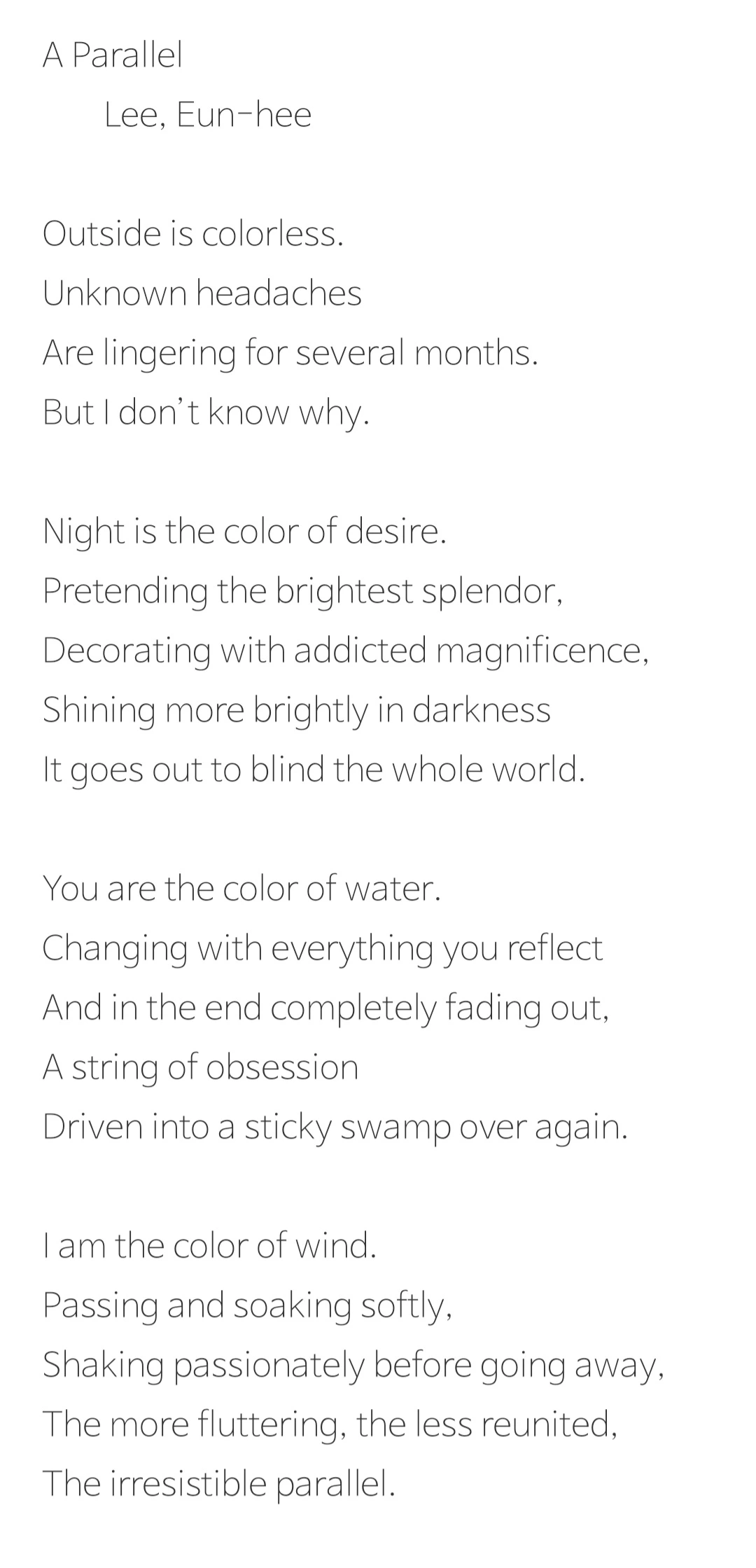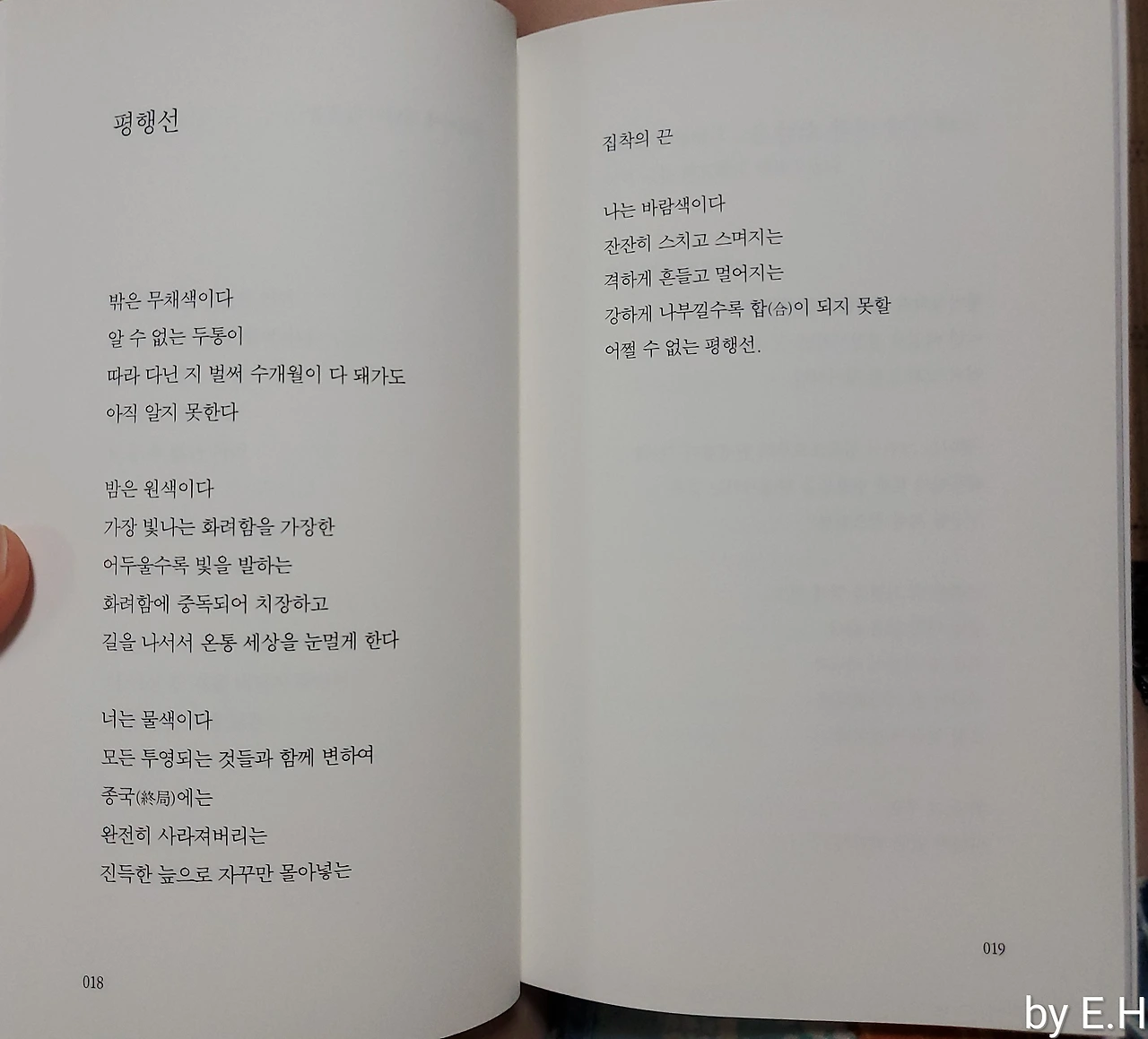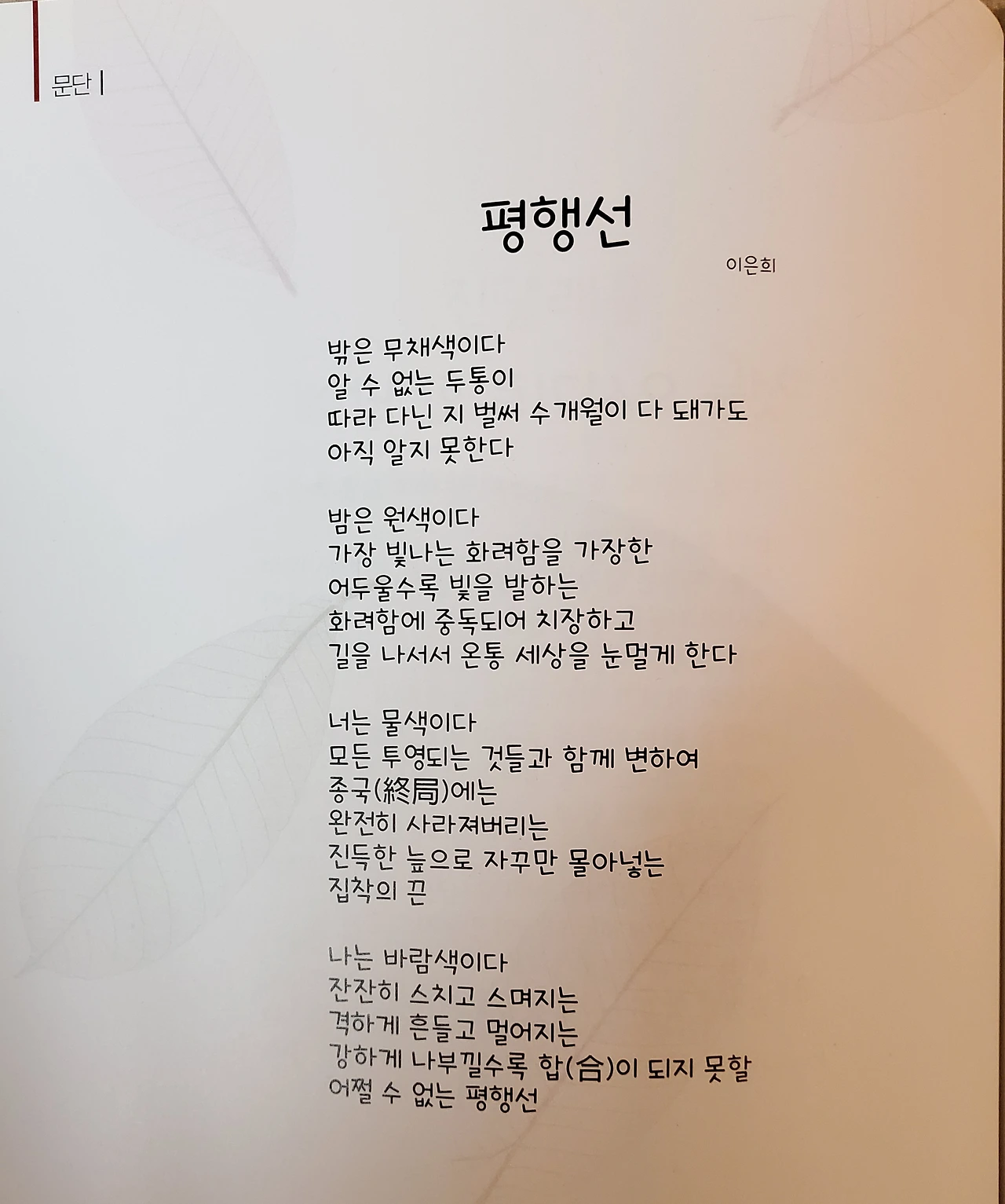 이은희 : 평행선 | 평행선 이은희 밖은 무채색이다 알 수 없는 두통이 따라다닌 지 수개월이 다 돼가도 아직 알지 못한다 밤은 원색이다 가장 빛나는 화려함을 가장한 어두울수록 빛을 발하는 화