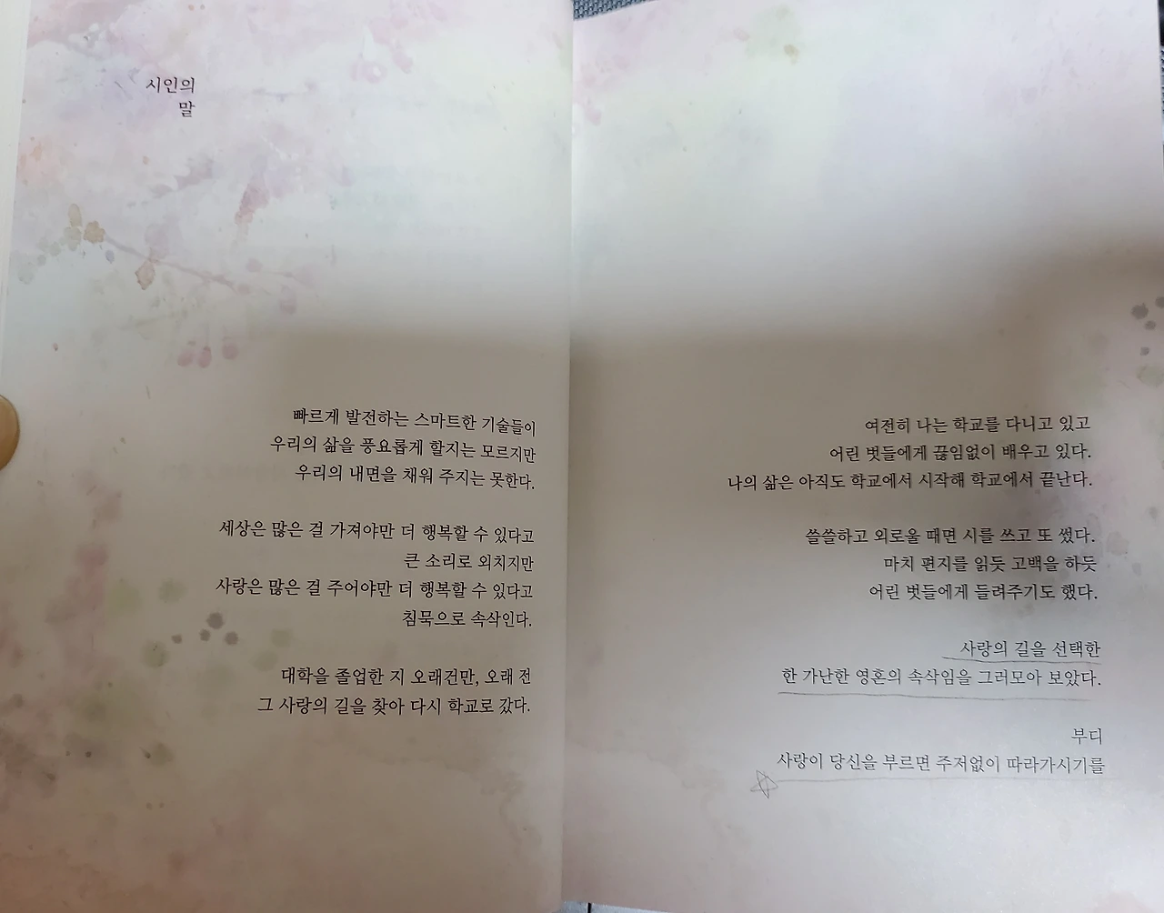 시집은 총 5부로 구성되어 있는데 그중 5부에는 지금 시인이 문학교사로 근무하는 고등학교에서의 자칭 ‘어린 벗’들과 함께 해온 추억들도 <교실 일지>라는 이름으로 담겨있다. 사실 5부의 시들도 소개하고픈 시들이 많았지만 지면 관계상 마지막으로 그래도 꼭 소개하고픈 시 한 편을 추가하며 이 서평을 마무리한다.