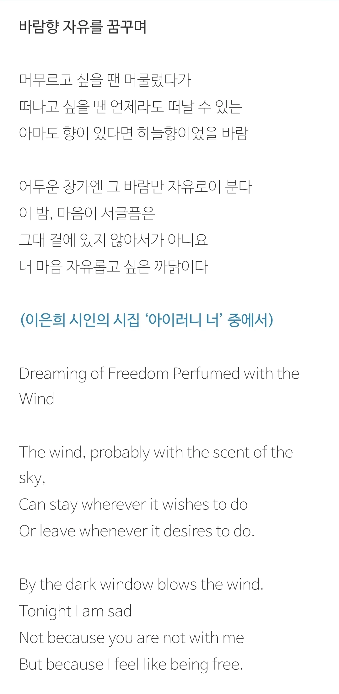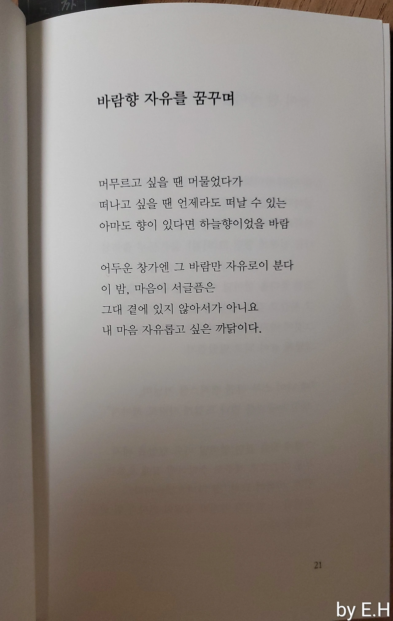 이은희 : 바람 향 자유를 꿈꾸며/ 그리움 점점 | 바람향 자유를 꿈꾸며 머무르고 싶을 땐 머물렀다가 떠나고 싶을 땐 언제라도 떠날 수 있는 아마도 향이 있다면 하늘향이었을 바람 어두운 창가