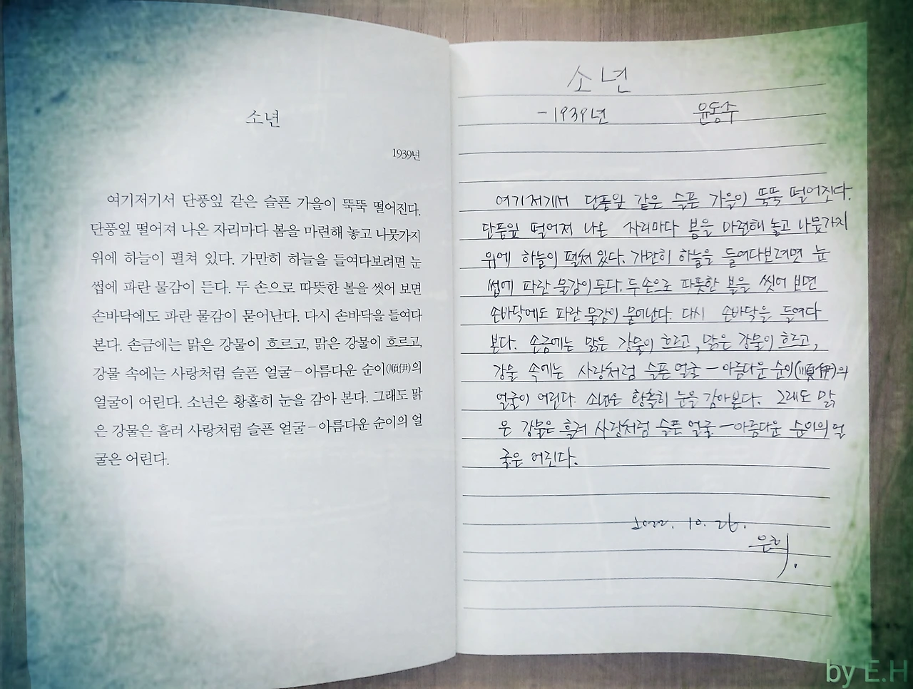 더 이상 가을이 깊어지기를 기다리면 안 될 것만 같은 그 기분으로 오늘 윤동주 시인의 詩 <소년>을 필사했다.