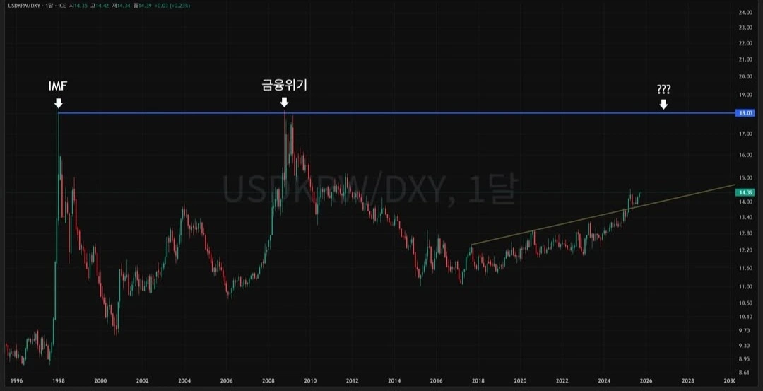 원화 (KRW)의 과거부터 현재까지의 흐름에 대한 이야기입니다. 이 차트를 설명하자면 이해가 어려울 수 있으니 그냥 흐름 또는 트렌드라고 하지요.