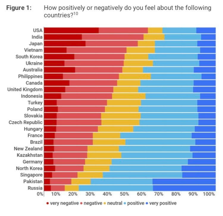 반면 중국인들은 한국인들을 그다지 싫어하지 않습니다. 과반을 조금 넘긴 정도지요. 미국에 대한 반감도 60%선을 조금 넘는 정도입니다. 두 그래프 모두 2022-24년 자료이지만 그다지 변했으리라고 보지는 않습니다 (아래 자료의 출처에 대한 의구심이 있는 분들은 직접 찾아보시기 바랍니다).
