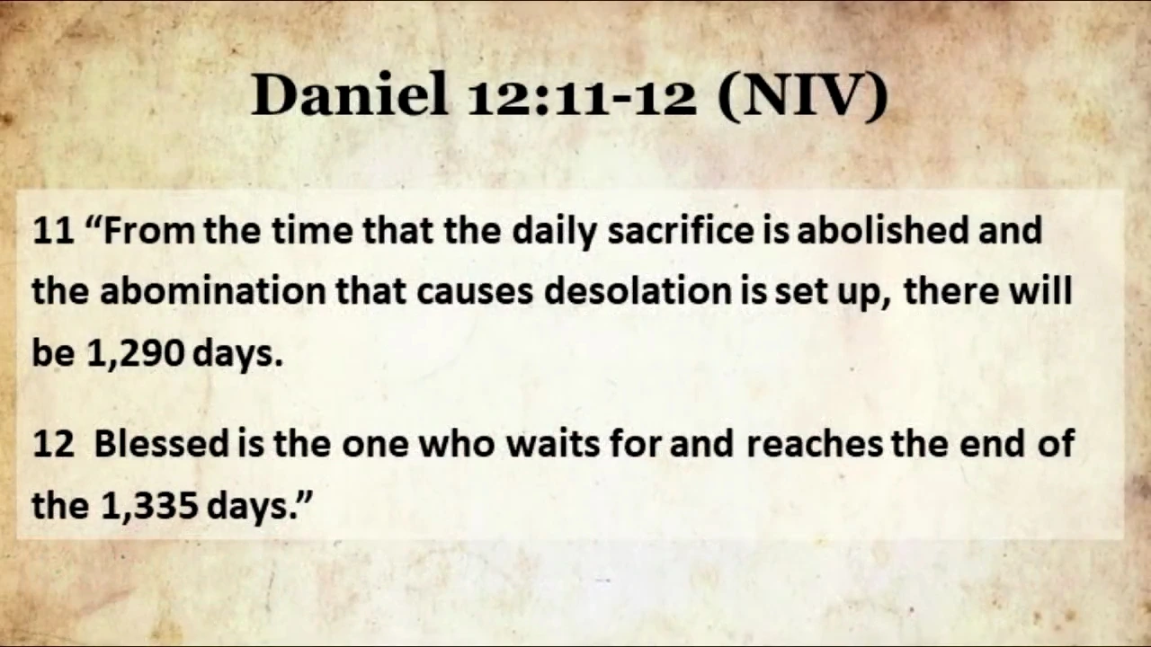 "From the time that the daily sacrifice is abolished and the abomination that causes desolation is set up, there will be 1,290 days" (NIV) / 매일 드리는 제사를 폐하며 멸망케 할 미운 물건을 세울 때부터 일천 이백구십 일을 지낼 것이요.