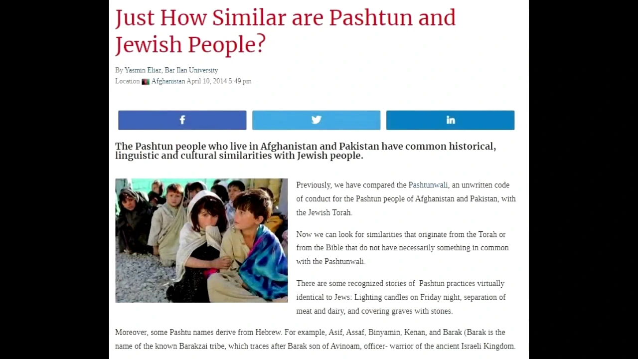 이때 아프간 탈레반은 대다수가 파슈툰족으로, 이슬람이었습니다. 지금도 그렇고요. 하지만 이들의 뿌리는 잃어버린 10개의 이스라엘 지파 중 하나에 연결되어 있다고 하지요. 파슈툰족이 진정 이스라엘의 잃어버린 지파의 후손인지에 대한 의문은 결코 명확히 답해지지 않을지도 모릅니다. 그러나 문화, 언어, 전통에서의 유사점과 강력한 구전 유산은 학자와 일반인 모두에게 이들이 유대인들이 아니라고 하기엔 어렵게 하고 있지요. 역사적 사실에 뿌리를 두었든 수세기 전의 전설에 기원을 두었든, 파슈툰족이 이스라엘의 잃어버린 아들들이라는 이야기는 사라지지 않는 서사입니다. 저는 이들이 그 지파들 중 하나라고 보고 있으며, 여러 언론사들도 이를 구체적으로 다룬 바 있습니다.