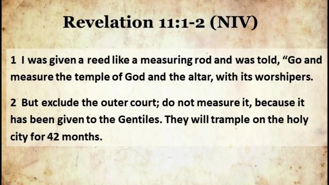 1. 또 내게 지팡이 같은 갈대를 주며 말하기를 일어나서 하나님의 성전과 제단과 그 안에서 경배하는 자들을 측량하되, 2. 성전 바깥 마당은 측량하지 말고 그냥 두라 이것은 이방인에게 주었은즉 그들이 거룩한 성을 마흔두 달 동안 짓밟으리라