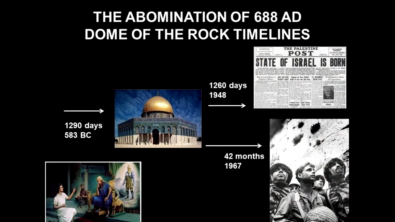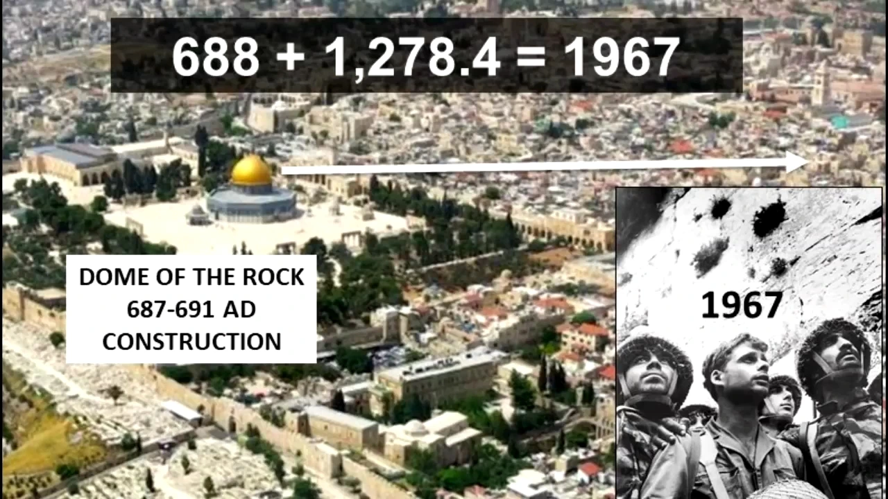 위에 언급한 Dome of the Rock이 건립된 시기, 즉 688년에 이를 더하면 1967년이 됩니다. 즉, 예루살렘에 이 가증한 것이 세워진 이후 1278년동안 이슬람, 즉, 짐승의 성산 짓밞기가 계속되었지만, 1967년 이후로는 더 이상 이슬람의 실질적인 침략은 중단되었지요.