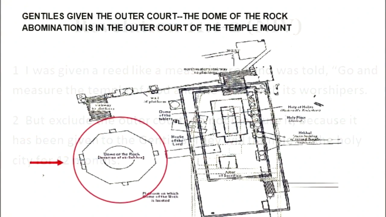 성산에 세워진 가증한 것이 두 개가 있다는 것을 이미 알려드렸지요? 그 중 하나가 Dome of the Rock 입니다. AD 688-691 경에 세워졌지요. 이들 이슬람이 이 건축물을 세울 당시 옛 솔로몬의 성전터 위에 지었다고 생각했지만 사실 그렇지 않았지요 - 이 Dome of the Rock 은 솔로몬 성전터 바로 옆에 있는 땅, 즉, 성전 바깥 마당에 위치하게 됩니다. 계시록에 예언된 대로 "성전 바깥 마당은 측량하지 말고 그냥 두라 이것은 이방인에게 주었은즉"이 예언대로 이루어진 것이지요.