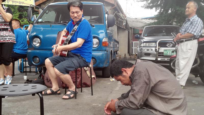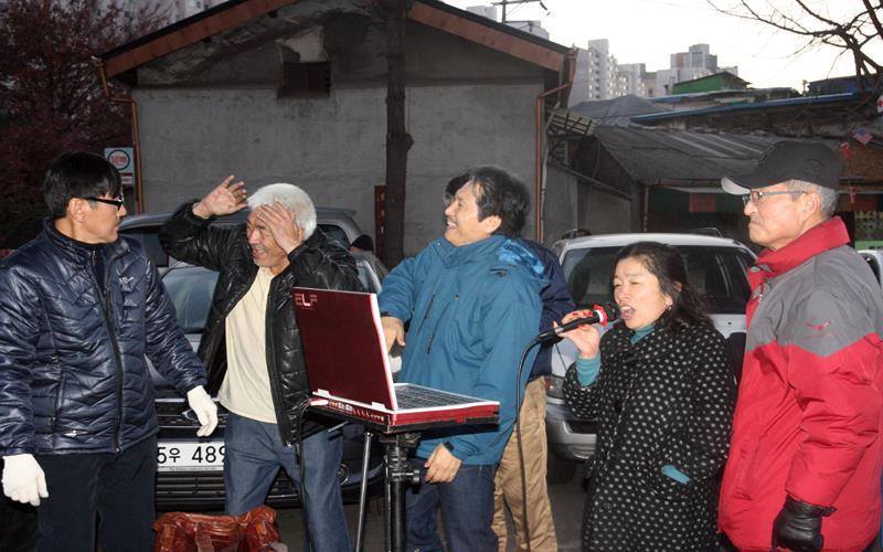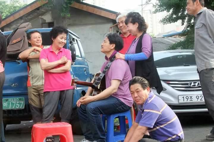 토요모임 후 뒷마당 (영등포역 선로 벽 너머) 에서 기타로 동네사람들과 친교를 하는 목사님 + 쪽방촌 주민들과 노숙자분들)