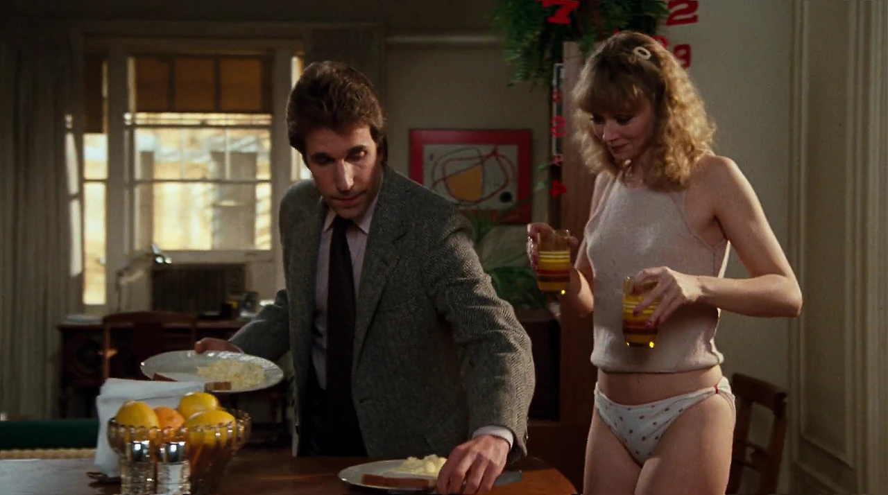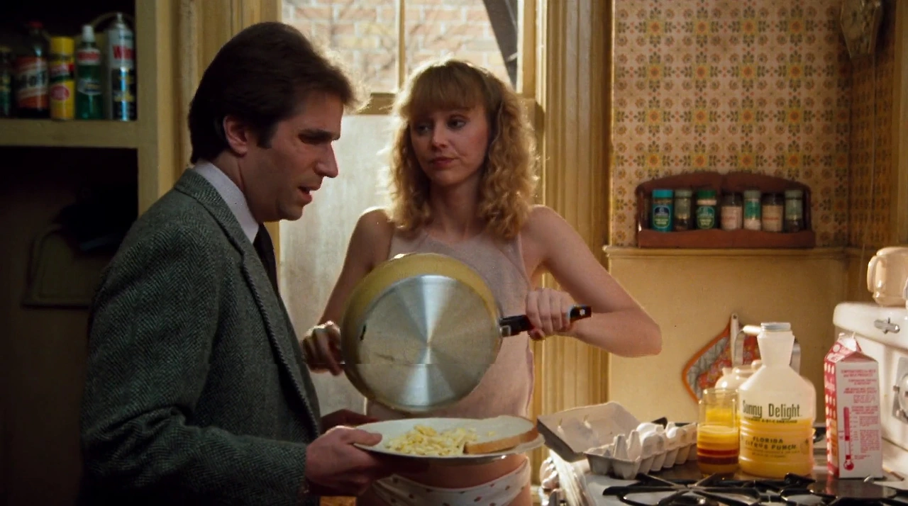이 둘은 어쩌다가 알게 된 escort 직업을 가진 Belinda (Shelley Long)을 알게 됩니다. 공교롭게도 Belinda는 Chuck과 같은 아파트의 같은 층에서 살고 있지요. 이 둘은 같이 아침도 같이 해 먹으며 친분을 쌓아갑니다. 직업상 편한(?) 옷차림을 하고 사는 Belinda를 자주 마주하며 Chuck 은 놀란 적도 한두 번이 아니지만 그래도 이 둘은 친한 친구로 그리고 이웃으로 지내지요. 아침 이른 시간에 한 명은 죽은 자들이 있는 시체안치소에서 퇴근하고, 하나는 모르는 남자들의 탐욕스러운 육체로부터 퇴근하는 삶 - 하지만 이 둘이 매일같이 함께 하는 아침식사가 그에게는 큰 기쁨이었을 듯합니다.