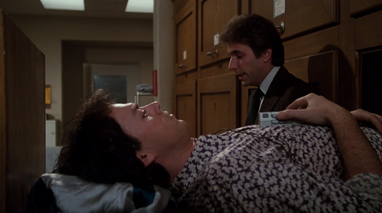 이야기는 대략 이렇습니다: Wall Street에서 stockbroker로 일하던 Chuck (Henry Wrinkler) 은 유능했지만 사람이 너무 착합니다. 결국 이 '선한'사람이 탐욕과 거짓에 시달린 나머지 심각한 스트레스를 받고 이에 염증을 느끼게 되지요. 이를 피해 사람들을 많이 대하지 않아도 될 직장을 찾던 중 뉴욕시 소속 시신 안치소 야간근무 담당직을 찾게 됩니다. 이 영화의 제목이 night shift 인 이유가 여기에 있지요. 이곳에서 조용히 일을 하게 된 Chuck 은 나름대로 평안한 삶을 살게 되고, 약혼자와의 얼마 남지 않은 결혼식을 준비 중입니다.
