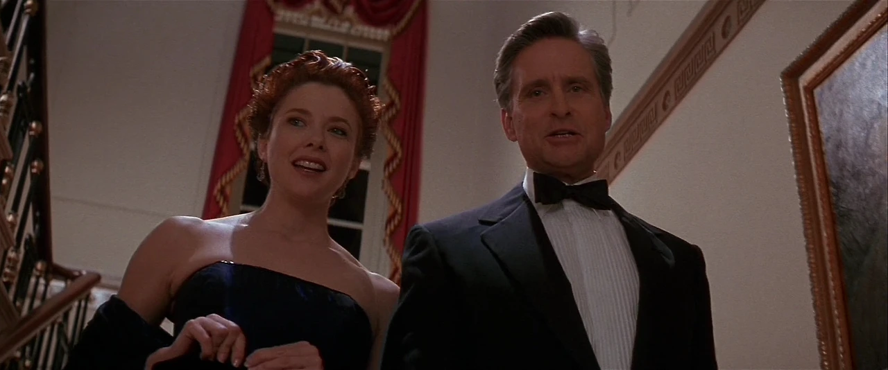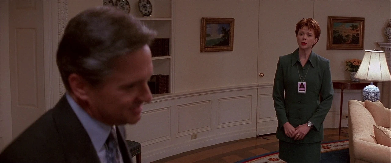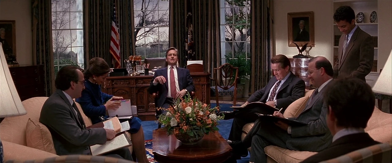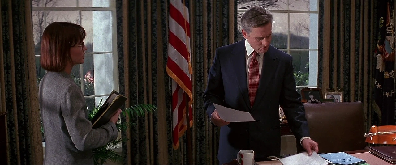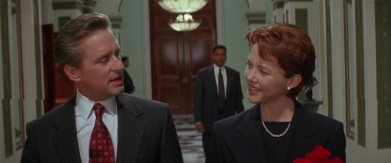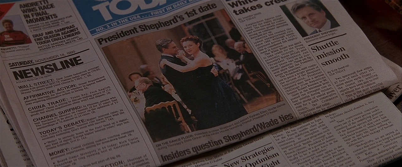 이 둘은 이후 연인 관계로 발전합니다. 하지만 이를 정략적으로 이용하려는 차기 공화당 대통령후보인 Senator Bob Rumson 에 의해 집중포화를 받습니다. Sydney 의 의심스러운 과거 전력을 하나하나 드러내며 심지어는 방송에서 "whore" 라는 comment 까지 할 정도로 Andrew Shepherd 대통령과 Senator Bob Rumson 의 마찰은 심해져만 갑니다. 동시에 대통령과 Sydney 의 관계 또한 전과 같이 않게 어려워져만 가지요. 대외적으로는 군사작전의 전개, 국내에서는 crime control bill 을 성사시키기 위한 노력과 함께 Sydney 를 보호하려는 대통령의 공적인 모습과 사적인 모습이 매우 사실적으로 나타납니다.