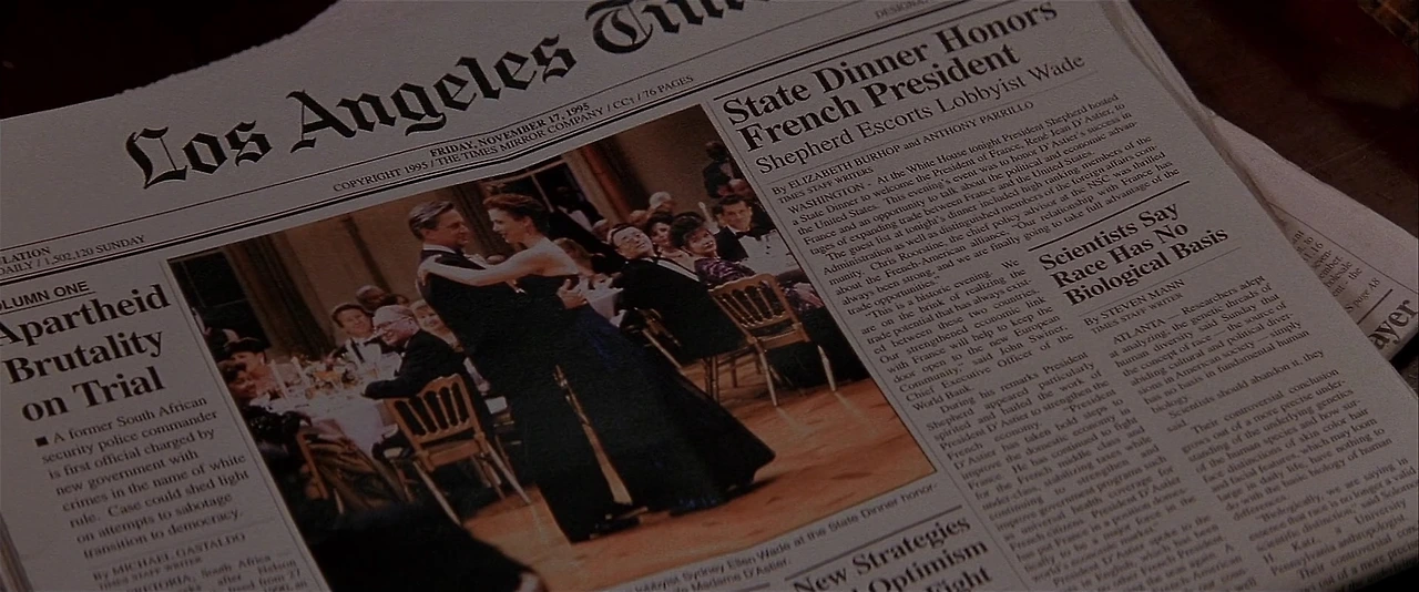 그 과정에서 환경로비스트인 Sydney Ellen Wade 와의 인연이 시작됩니다. 업무상 자주 접하게 된 관계가 관심의 상대로 발전하고, 이미 일정이 잡혀있는 프랑스 대통령 내외 국빈 방문일정에 정계에는 한 번도 얼굴을 내밀어 본 적이 없는 그녀를 초대하기에 이릅니다. 사실 이 자리는 대통령의 오랜 친구이자 사촌인 Judith 가 대통령의 의전 파트너로 오기로 했었지만 갑자기 몸이 아파서 참석이 어려웠고, 그 자리를 Sydney 가 우연히 채워준 결과가 되었습니다. 영부인이 할 만한 의전까지 아주 수월하게 소화한 Sydney 는 날 밤 대통령과 아름다운 춤까지 추게 되고, 미국 전체가 이 여성의 존재를 알게 됩니다.
