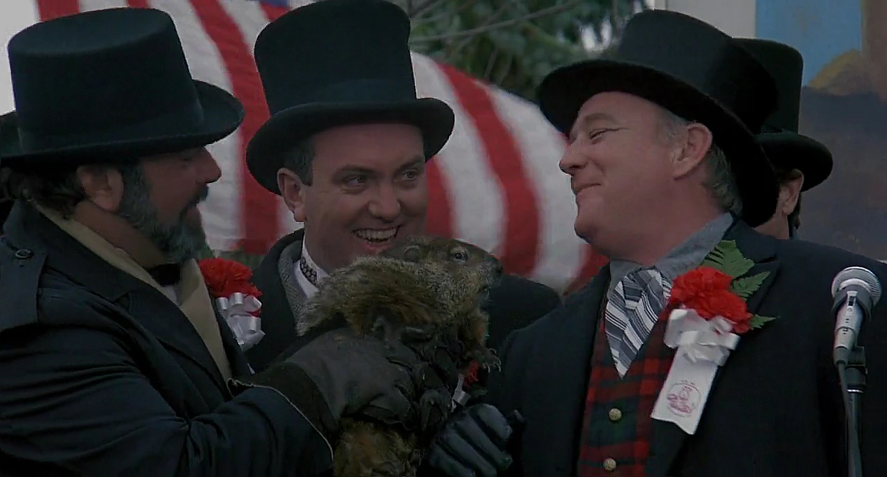 담당 PD Rita라는 여자와 카메라맨은 Larry - 이 세 명이 밴을 타고 Punxsutawney Phil을 취재하러 Punxsutawney, 펜실베이니아에 가지요. Rita와 Larry는 평범한 시골 마을호텔에 투숙을 하고, Phil 은 고급 민박집에서 하룻밤을 보냅니다. 다음 날 오전 6시에 Phil 은 알람시계에서 흘러나오는 라디오 방송국 프로그램 소리에 눈을 뜹니다. Sonny & Cher의 "I Got You Babe"가 흘러나오고, 깔끔한 아침을 맞지요. 화창한 아침, 그는 민박집 사람들과 길에서 만나는 사람들과 인사를 한 후 행사가 열리는 공원으로 향합니다.