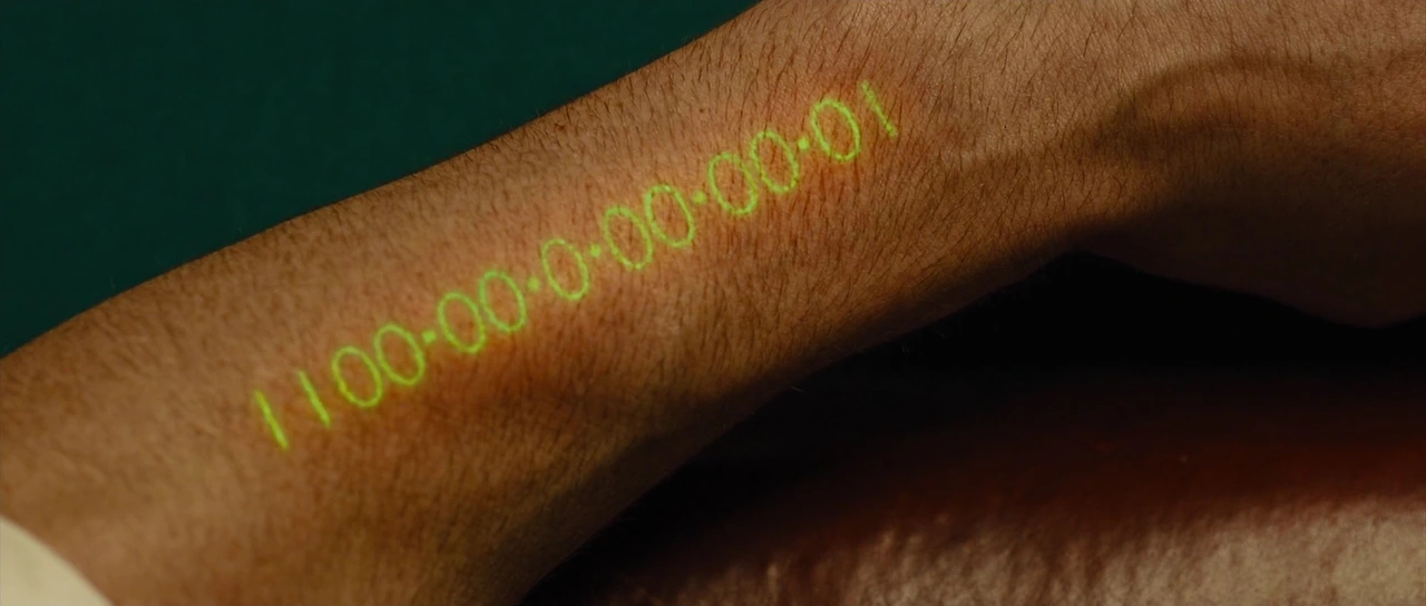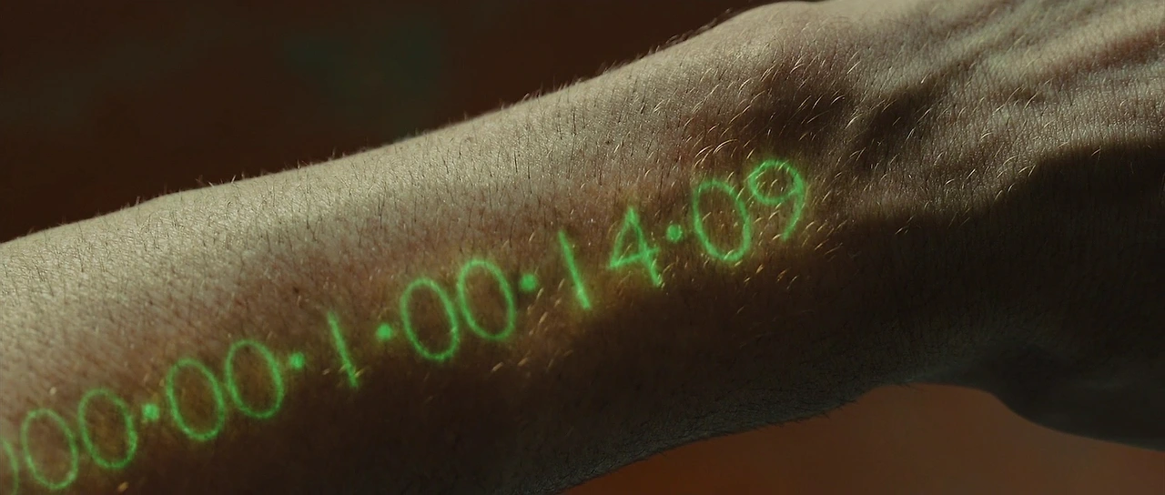 모든 상거래 매매 또한 오른팔을 통해 이루어집니다. 회사에서 하루의 업무가 끝이 나면 회사를 나서면서 오른팔에 주급을 주입받습니다. 일한 만큼의 봉급이 시간으로 환산되어 수명으로 (즉, 시간으로) 입력되는 것이지요. 즉, 시간이 currency 인 세상을 참 묘하게 그려내고 있습니다. 기발한 아이디어로 만들어진 영화지요.