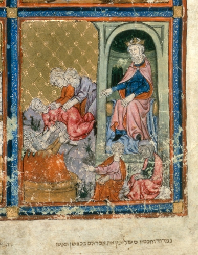Description: Nimrod ordering his servants to cast Abraham into the fiery furnace, while Abraham is saved by two angels, detail of a miniature depicting scenes from Genesis.