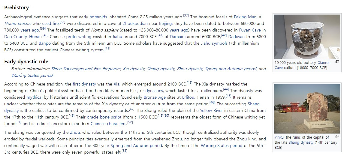 이와 연계해서 중국의 역사를 한 번 볼까요? 쉽게 접근하기 위해 Wikipedia를 보면 중국의 역사는 early hominids 란 원숭이의 후예들이 2.5 million 년 전부터 지금의 중국에 거주하기 시작했다고 합니다. 근거도 흐릿하지요. 한 예로 올려있는 pottery를 보면 18000 BC에서 7000 BC에 만들어졌다고 합니다. 이런 방식의 ranging 이 carbon dating 가 틀릴 수 있음을 알려주지요 (이런 식의 guessing game 은 누구나 할 수 있습니다).
