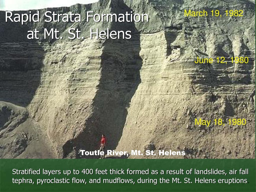 예전에 고고학 및 인류학에서 자주 쓰이는 carbon dating method 가 그 신빙성이 낮다는 이야기도 해 드렸는데, 이는 예전 에피소드에 소개했던 1980년대 초반 있었던 미국 Washington 주에 있는 Mount St Helens의 화산활동과 이 결과 생긴 적층구조를 보더라도 이 carbon dating method의 오류가 드러나지요. 아래 사진들이 이를 증명하는데, 짧게는 6일 동안 마치 Grand Canyon의 계곡들과 같은 지형이 형성되고, 길게는 2년 동안 적층구조가 마치 수백만 년 동안 만들어진 지층구조와 별다른 차이 없이 형성되었습니다. 이곳에서 carbon dating을 실행해도 몇백만 년 전에 형성되었다는 오류 결과가 나왔다고 하더군요. 이 계통에서는 science 가 정확하지 않음을 단적으로 증명하는 자료입니다.