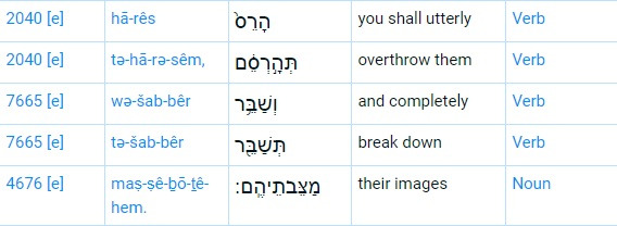 2. 출애굽기 34:13 KRV. 너희는 도리어 그들의 단들을 헐고 그들의 주상을 깨뜨리고 그들의 아세라 상을 찍을지어다 (Break down their altars, smash their sacred stones and cut down their Asherah poles)