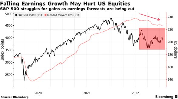 지금의 또 다른 현실은 기업성장이 완만하게 둔화될 뿐만 아니라 사실상 하락세로 가속되고 있다는 것입니다. 4분기 어닝 시즌은 부정적인 레버리지 이론을 확인시켜 주고 있습니다. 게다가 마진 역풍은 기술주만의 문제가 아닙니다. 지난 1년 동안 여러 번 언급했듯이 S&P 500 산업 그룹의 80%가 매출 증가보다 비용 증가를 경험하고 있다는 사실에서 알 수 있듯이, 지금의 S&P 500 18배 밸류에이션 또는 성장에 대한 희망은 몇 단계 내려가야만 할 것입니다. 이는 역사가 말해주고 있지요. S&P 밸류에이션이 16으로 다시 가야 한다는 의미는 S&P 500 지수가 3300 또는 그 이하에 위치해야 함을 의미합니다. 아마도 2023년 1분기 말 또는 2분기 초에 일어날 것으로 예상됩니다.