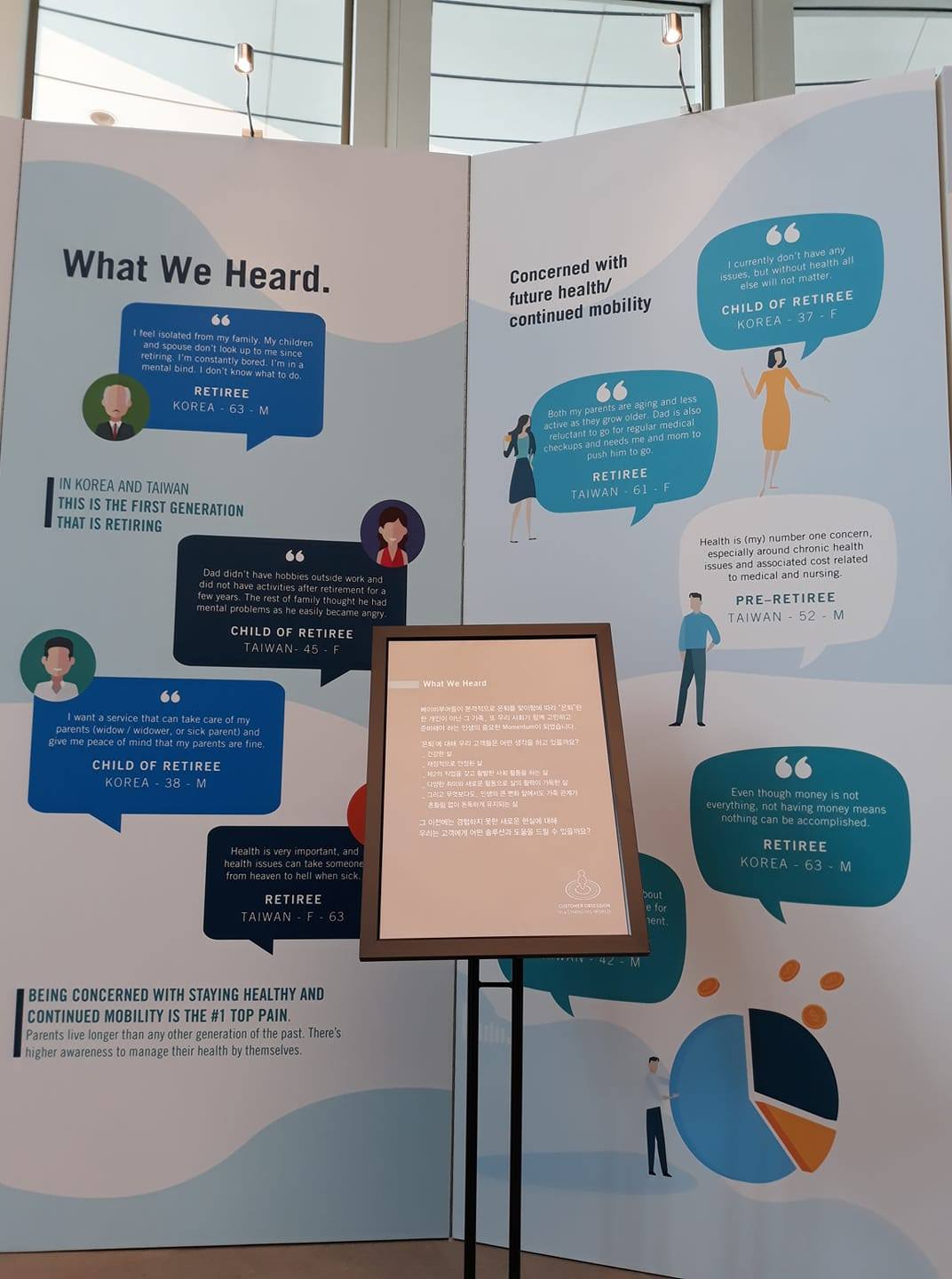 Prudential 본사 lobby에 2년 전인가 있던 사내 홍보물이었습니다. Retiree, retiree, retiree.... child of retiree, pre-retiree.... #1 top pain 등 보고 있으니 웃음만 나오는 표현들입니다. 전치사 등도 실종된 부분이 많고요.