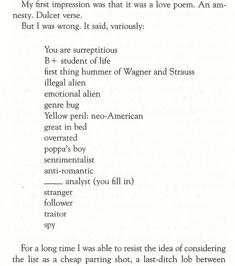 1995년에 출간된 Chang-rae Lee 교수의 Native Speaker라는 소설책 5페이지에 보면 주인공인 Henry의 백인 아내인 Lelia 가 공항에서 떠나기 전 그에게 전해준 쪽지의 내용이 보입니다. 잠시 떠나는 아내가 남편이라는 사람을 몇 가지의 단어들로 정의한 것들로 내용은 이랬지요.