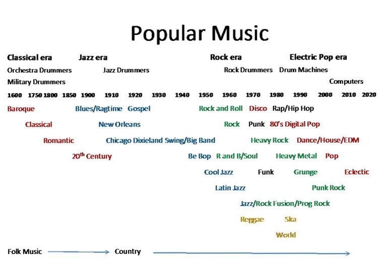 아래는 1900년 이후 지금까지 서구권 pop music 이 어떤 흐름을 따라왔는지 보여주는 illustration 입니다. 지금도 많은 사람들이 듣고 있는 genre 들의 대부분이 1960년대, 70년대, 그리고 80-90년대에 등장했지요. 전설이 된 가수들도 모두 이 시대에 최고의 인기를 누렸습니다.