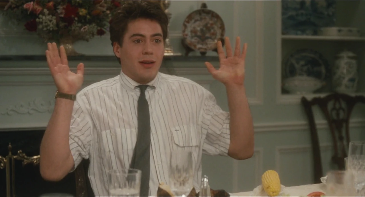 1989년작 Chances Are에서 Robert Downey Jr. 가 보여준 한 장면, 그리고 2014년작 The Judge에서 그가 다시 보여준 모습을 보며 "아, 이 배우의 이 행동 (얼굴을 두 손으로 가리는 행동) 은 연기가 아닌, 자신이 평상시 당황했을 때 취하는 것일지도 모르겠구나!"라는 확신이 들었습니다. 25년이 지난 2014년 영화에서도 이 모습을 보여주었으니까요. Avengers 시리즈에서도 그가 이 모습을 보였는지는 저는 모릅니다 - superhero 영화는 아무리 영화라 해도 웬만해서는 보고 싶지 않은 genre라서 말이지요.