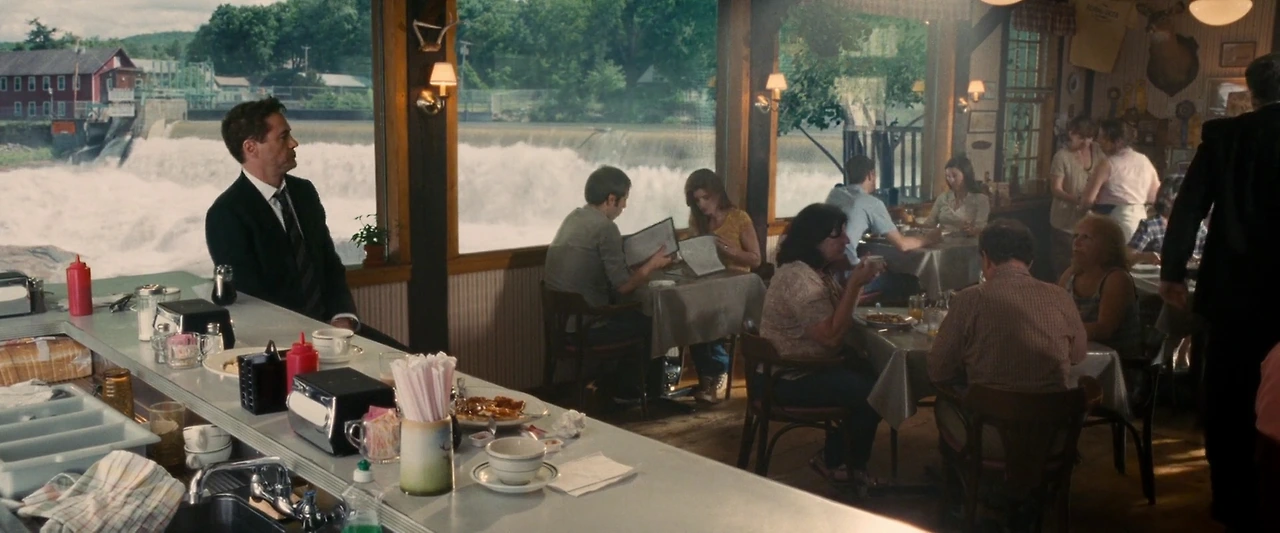 영화의 주요 장면이 법정에서 촬영되었지만, 또 하나의 장소가 Flying Deer Diner라는 식당이었습니다. 영화는 인디애나 주에 위치한 Carlinville 이란 township을 배경으로 하지만 실제는 Massachusetts에 위치한 (on the Mohawk Trail) Shelburne Falls라는 마을이었답니다. 식당 옆에 있는 여러 개의 큰 창문들을 통해 볼 수 있는 저 man-made 폭포는 아마도 이 식당에서만 볼 수 있는 장관이겠지요. Niagra Falls 보다도 더 매력적인 곳일 듯합니다. 언젠가 저곳에 가서 Downey Jr. 가 먹었던 음식을 주문할 예정입니다.