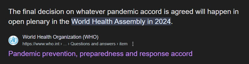 상황이 이러한데 WHO 에서는 WHO Treaty 또는 Pandemic Accord 라는 것을 모든 국가에 강요하다시피 동의를 요구하고 있답니다. 미국 및 영국에서는 이에 대해 많은 이슈가 제시되고 있는데, 2024년 올해 5월 27일부터 6월 1일까지 진행되는 World Health Assembly 에서 결정한다고 합니다.
