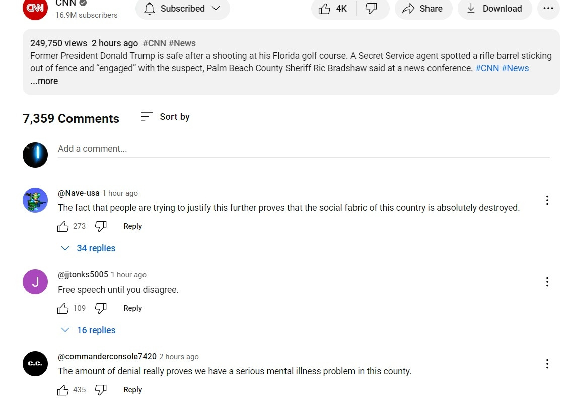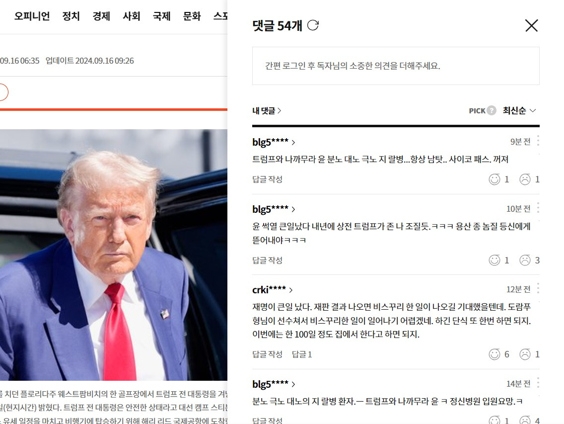 이런 선들의 흔적은 댓글들에서 잘 나타난다는 생각입니다. 오늘 오후, Trump 전 대통령에 대한 암살시도가 또 있었습니다. 이에 대한 댓글은CNN 이나 mainstream media 에서는 볼 수 없지만, Youtube 를 통해서는 일반 미국인들이 가진 이 사건에 대한 솔직한 생각을 잘 읽을 수 있지요. 실명제도 아니고, 사실 아무 말이나 해도 무관한 social network 니까요. 미국 내에서 Trump 라는 사람에 대한 의견이 가장 뜨거운 것임은 당연하지요? 한국에서는 윤석열, 이재명, 한동훈 등에 대한 그것처럼 눞지는 않아도, 선거때라 열기 수준은 매우 높습니다. 솔직한 의견들이 익명의 댓글로 나타나는 것은 아마도 그 사람들이 속한 사회의 건강함이 어떤지도 파악할 수 있다는 생각입니다.