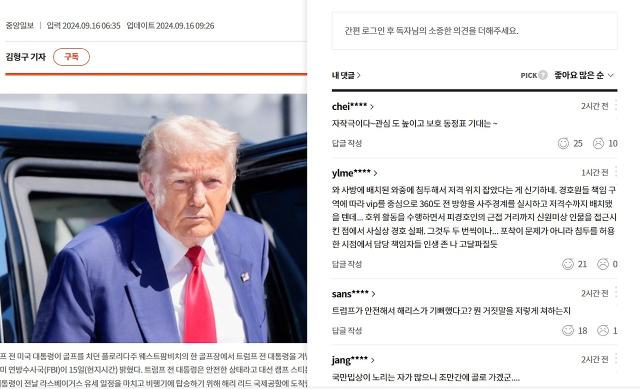 조선일보는 선택하지 않았습니다. 워낙 편파적인 언론사인데다가 독자들도 같은 수준이니까요. 동아일보도 빼겠습니다. 거긴 댓글반응이 없는 특이한 성향이 있습니다. 그 중간쯤 되는 중앙일보를 보겠습니다 (여타 언론사: 한겨례, 경향, 민중의 소리 등은 빼겠습니다).
