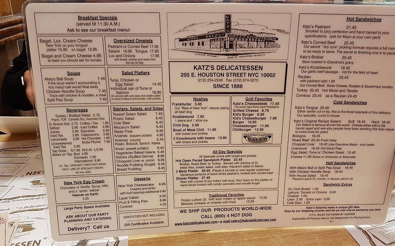 뉴욕의 상징적인 식당을 떠올리면 Peter Luger Steakhouse, Patsy’s Italian Restaurant, 그리고 차이나타운의 Wo Hop을 떠올리는 분들이 많습니다. 하지만 이런 touristy 할 정도로 유명한 식당들에 비하면 Katz’s 의 인지도는 떨어지긴 합니다. 아마도 이 식당 메뉴가 유대인 델리이기 때문에 맛이 좀 없다고 생각하는 사람들이 많아서인 듯 합니다. 이 곳에서는 100년 넘게 rye bread 에 classic pastrami 를 넣은, 그리고 matzoh ball soup 을 메인 메뉴로 제공하는데, 이 메뉴는 그다지 맛은 없지요. 그렇다고 다 맛이 없지는 않고 맛나는 메뉴도 많은 편입니다. Katz’s 는 뉴욕시와 인근 지역에 남아 있는 20여 개의 유대인 델리 중 하나이며, 매년 문을 닫는 유대인 델리도 계속 생겨나고 있습니다. 전통을 이어가고 있는, 하지만 의외로 잘 알려지지 않은 명소입니다.