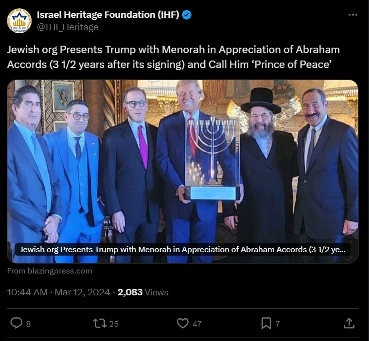 더 황당했던 일은 지난 2024년 3월, IHF 에서는 Trump 의 지원으로 중동의 이슬람 국가들과 체결한 "아브라함 협정" 등에 감사하여 Donald Trump 에게 이스라엘 전통의 촛대 (menorah) 를 선사하고, 그를 Prince of Peace (평화의 왕자) 로 부르도록 했다는 점입니다. 이 협정 이후 3년 반이 지난 시점이었지요.