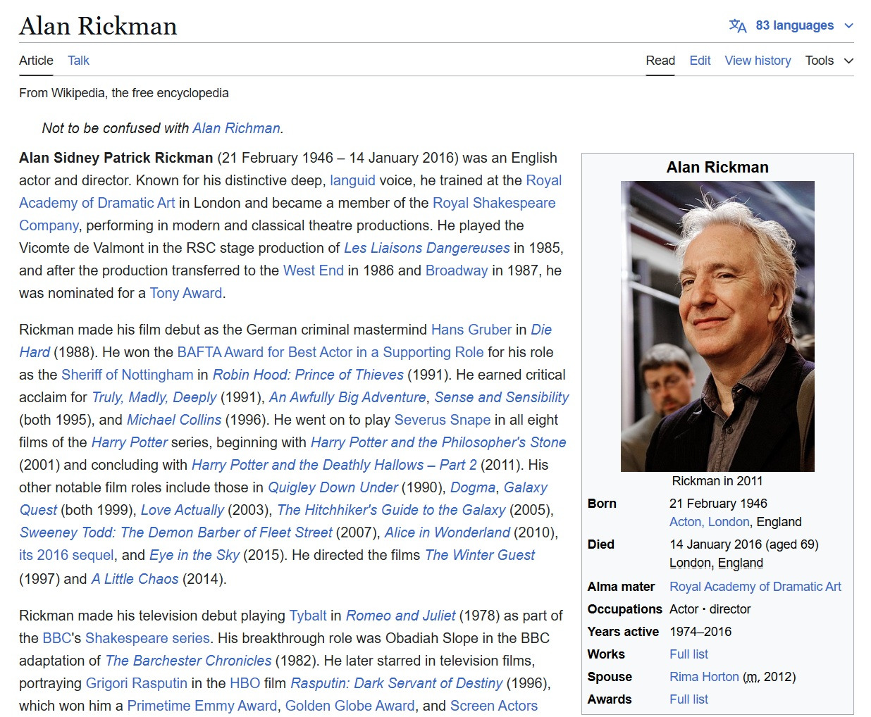 Alan Rickman 은 high school sweetheart 와 결혼하여 평생을 살았답니다. 외박을 안 하려고 무던히도 애를 썼고, 해외에 나갈 경우는 아내가 바쁘지 않으면 동행했다고 하는군요. 잘 생긴 사람도 아니었고, 무겁고 차가운 외모의 배우였지만 아내와의 사랑은 굳건했다는 아내의 말도 적어봅니다.